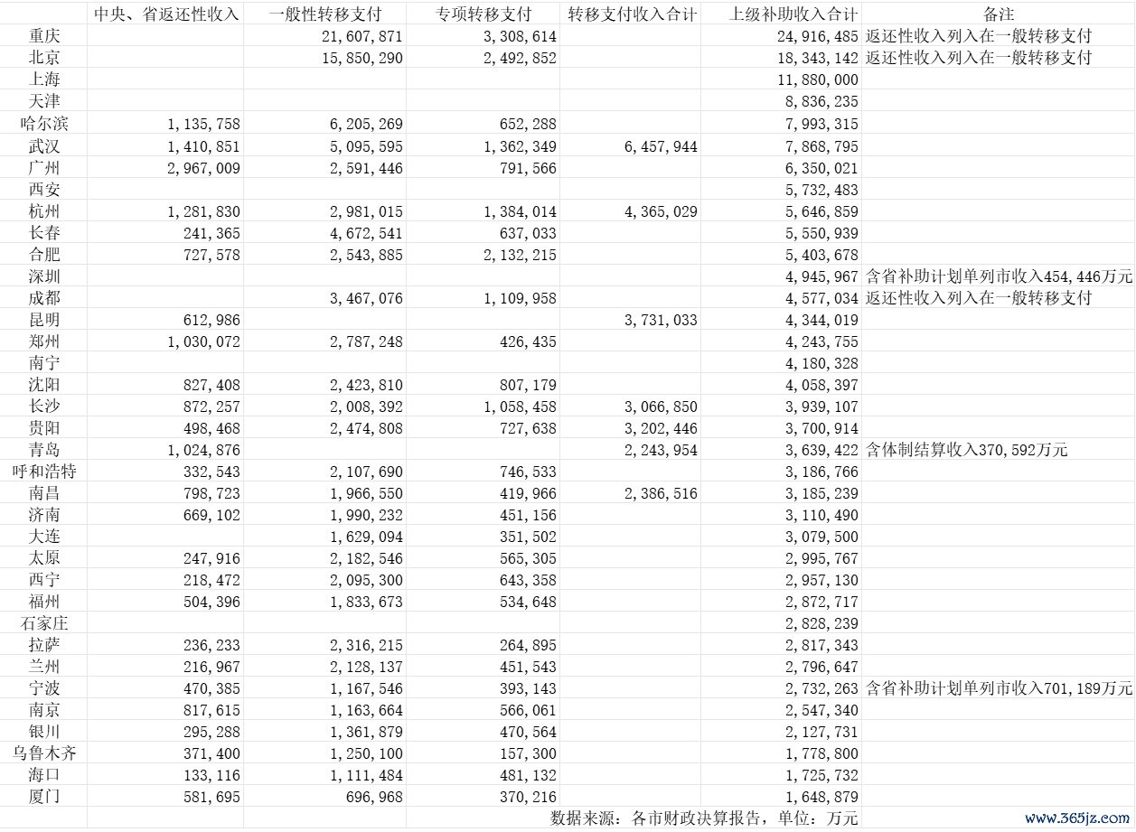 直辖市的转移支付来自中央财政,其他省会城市和计划单列市的上级补助收入则包括中央和省级财政。