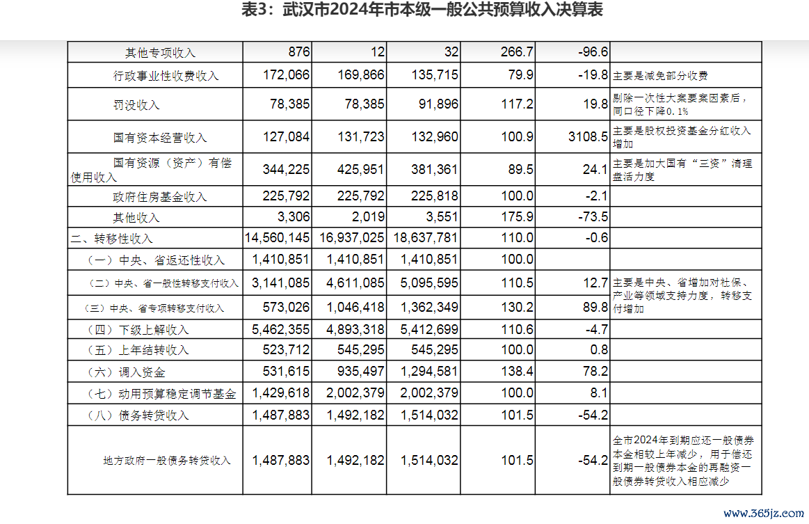 武汉市一般性转移支付收入和专项转移支付收入预算数分别为314.1亿和57.3亿元,不过,最终决算数为509.56亿和136.23亿元。武汉市财政局说明,主要是中央、省增加对社保、产业等领域支持力度,使得转移支付增加。